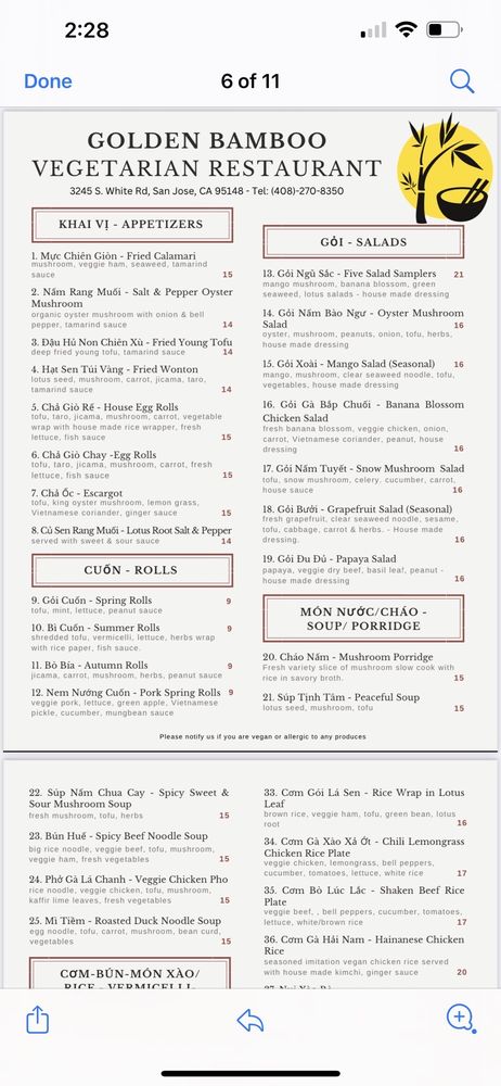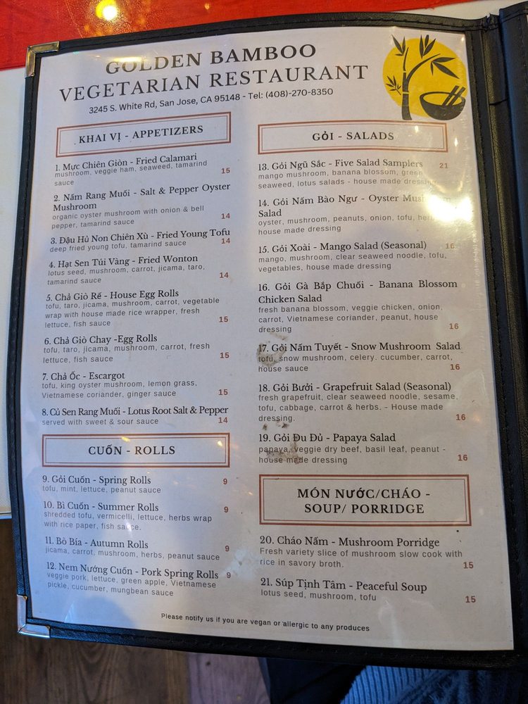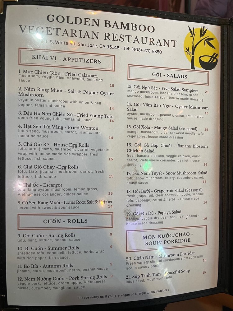 Golden Bamboo Vegetarian Menu (Update 2025)