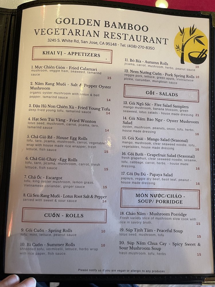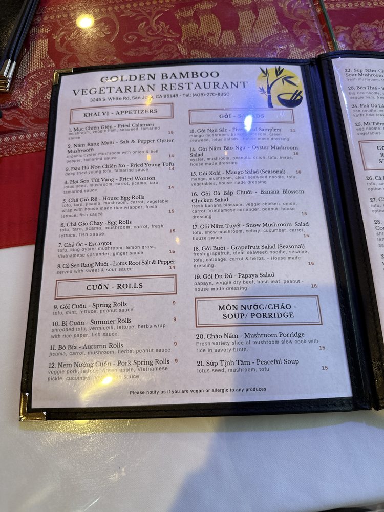 Golden Bamboo Vegetarian is a Vietnamese vegetarian restaurant located in San Jose, CA offering a variety of breakfast and brunch options. With a focus on vegan and vegetarian dishes, the menu includes dishes like fried mushrooms, duck soup with egg noodles, grapefruit salad, and salted fish fried rice. Customers have praised the delicious food and friendly service, with favorites including house egg rolls, five salad sampler, and Vietnamese sweet and sour hotpot. The ambience of the restaurant, decorated with Asian flair and soothing instrumental music, adds to the overall dining experience. Despite some minor service issues, the overall consensus is positive, making Golden Bamboo Vegetarian a must-try for those seeking flavorful and unique vegetarian Vietnamese cuisine.